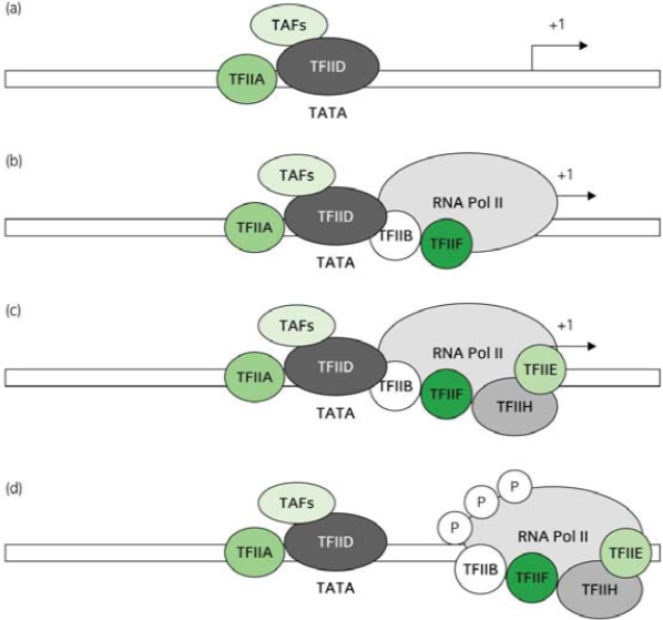 RNA 중합효소Ⅱ에 의해 전사되는 유전자의 프로모터에는 전사 지역 주변에 존재하는 여러 개의 다양한 염기인자가 존재합니다. 이중 처음으로 확인된 것은 전사 개시 부분으로부터 25~30개의 염기 상위 지역에 있는 TATAA와 비슷한 염기 서열입니다. 이 염기 서열(TATA box)은 박테리아 프로모터의 -10 염기 인자와 비슷하며, RNA 중합효소에 의해 전사되는 유전자 프로모터의 일반적인 특징이라고 생각하였습니다. 그러나 최근 게놈 수준의 분석에 의하면 RNA 중합효소Ⅱ 프로모터의 10~20% 만이 TATA box를 가지고 있습니다. RNA 중합효소Ⅱ 프로모터에 존재하는 또 다른 염기 인자로는 전사 시작 부위를 포함하는 Inr(initiaor) 인자, 전사 시작 지점 상위에 존재하고 전사 인자 TFⅡB가 인식하는 BRE와 전사 개시 지점의 하위에 존재하는 DPE, DCE, MTE가 있습니다. 각각 다른 유전자는 각각 다른 염기 인자 조합을 가지고 있어 그 조합에 의해 전사인자들과 결합하는데 그 기능을 나타냅니다.