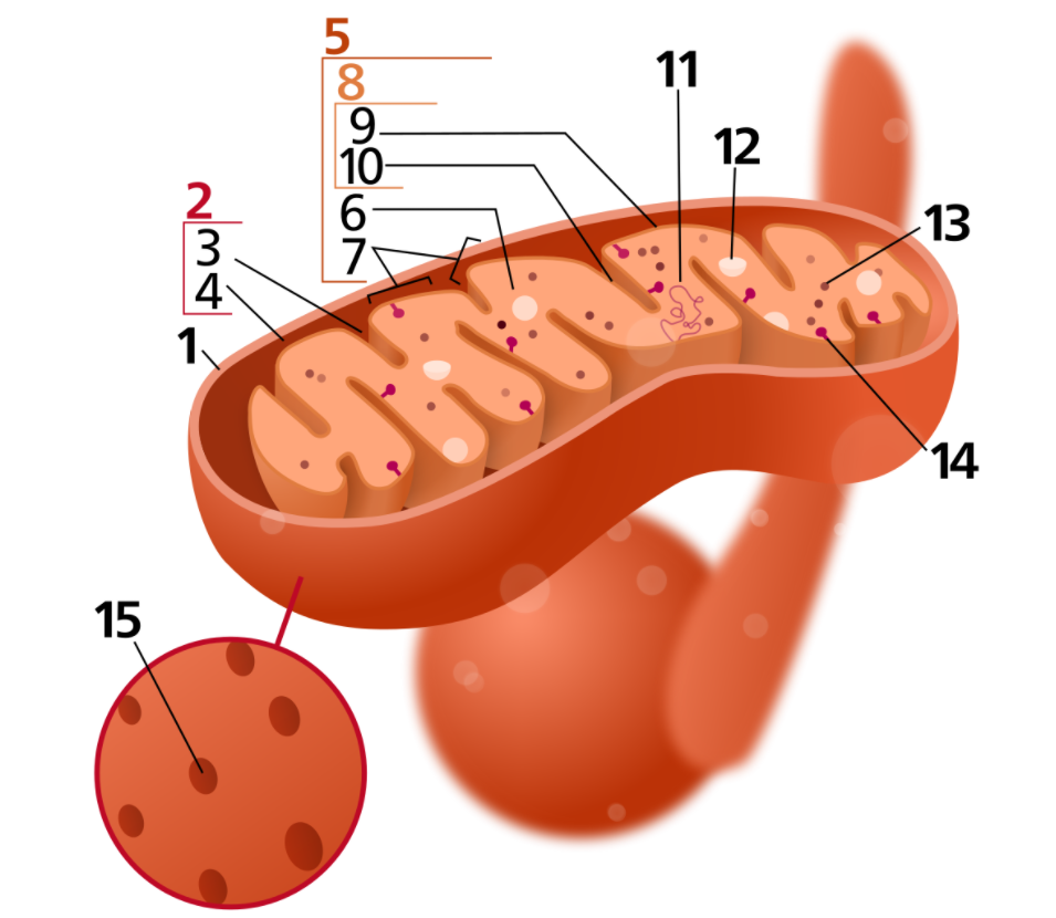 미토콘드리아는 내막과 외막 등 이중막으로 둘러싸여 있으며 막간 공간으로 분리되어 있습니다. 내막은 미토콘드리아의 기질(matrix)로 돌출되어 크리스테(cristae)를 형성합니다. 이들은 각각 고유의 기능을 갖고 있으며, 이중 기질과 내막이 미토콘드리아 내에서 주요 기능을 하고 있습니다.