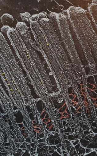 세포 표면 돌기 중에 가장 잘 알려진 것이 미세융모(microvilli)입니다. 원형질막이 손가락처럼 확장되어 있는 이 구조는 특히 장 표면의 상피세포와 같이 흡수를 담당하는 세포의 표면에 풍부하게 존재합니다. 이러한 세포의 미세융모는 브러시 보더(brush border)라 부르는 정단면 표면에 층을 형성하는데, 세포 당 약 천 개의 미세융모로 구성되어 있습니다. 그 결과로 흡수에 필요한 노출된 표면적이 약 10-20배 증가됩니다. 흡수 과정에서 역할뿐만 아니라 특수한 형태의 미세융모인 청각세포의 부동섬모(stereocilia)는 소리의 진동을 감지하여 청각기능을 수행합니다.