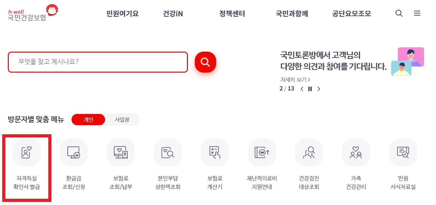 국민건강보험공단으로 접속하시면 아래와 같은 메인 화면이 뜹니다. 여기에 [방문자별 맞춤 메뉴]>[자격득실 확인서 발급]을 클릭합니다.